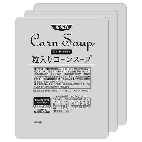 ●原材料/スイートコーン(タイ産・国産、遺伝子組換えでない)、濃縮乳、ソテーオニオン、小麦粉、砂糖、チキンエキス、食塩、バター、ナチュラルチーズ、オニオンパウダー、酵母エキス、香辛料