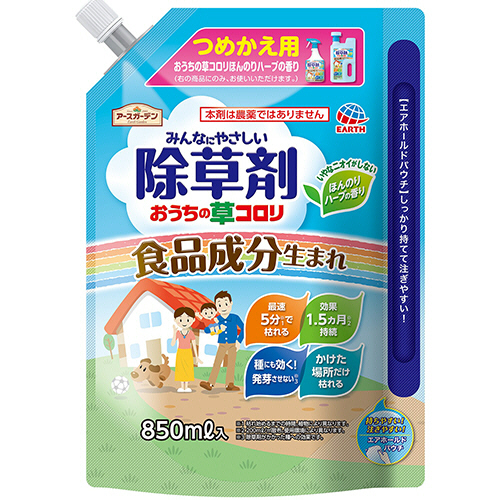 ●食品成分(ペラルゴン酸)から作られた除草剤「おうちの草コロリほんのりハーブの香り」の詰替え850mlです。
