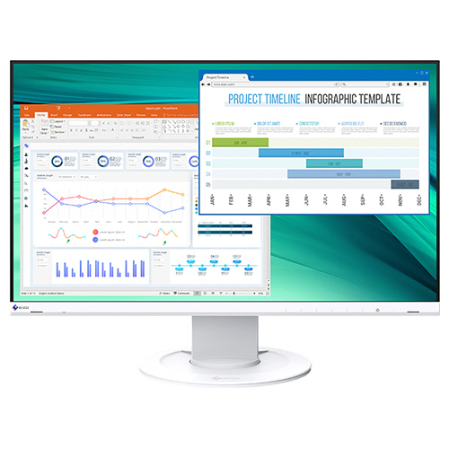 ●23.8型1920×1080解像度のIPSパネルを搭載したホワイトの液晶モニター。横幅537.8mmの省スペース設計のため、一般的なオフィスデスクはもちろん、コンパクトな昇降デスクにも設置が容易です。