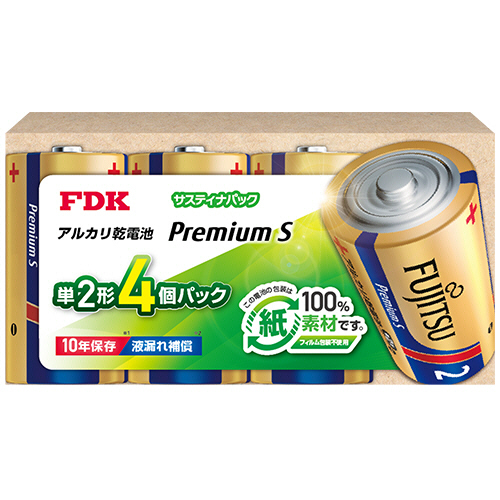 ●紙100%の素材を包装に使用したサスティナパックです。単2形、4本入。