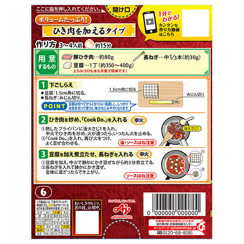 ●原材料/[原材料]しょうゆ、食用植物油脂(大豆油、ごま油)、甜麺醤、豆板醤、砂糖、豆鼓、にんにく、食塩、チキンエキス、チキンオイル、唐辛子、にんにくパウダー、花椒、発酵調味料 [添加物]調味料(アミノ酸)、糊料(加工でん粉、キサンタン)、パプリカ色素、(一部に小麦・大豆・鶏肉・ごまを含む)