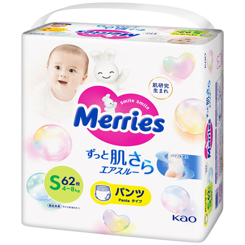 ●おむつの外側に湿気をスル~ッ。おしっこ後もつけたての状態に。ずっと肌さらつづく。パンツタイプの紙おむつ、Sサイズ・62枚×3パックセットです。