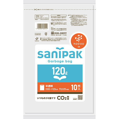 ●120L、10枚入です。「サニパックポリ袋 nocoo in」の中でも標準タイプよりも厚さがあり、破れにくい「しっかりタイプ」。ひっぱりに強いゴミ袋です。