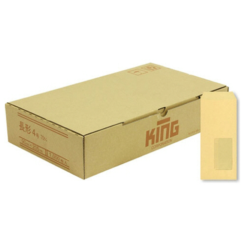 ●口のりなしの窓明封筒、郵便番号枠なしの長4・クラフト色、1000枚入です。窓の位置は封入口を上にして右下です。