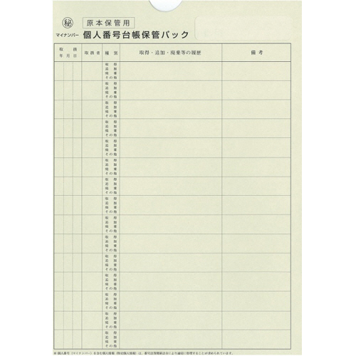 個人番号台帳兼届出書(日本法令/マイナンバー2-1)および扶養親族分の本人確認書類等を世帯単位で保管・管理できる専用封筒です。