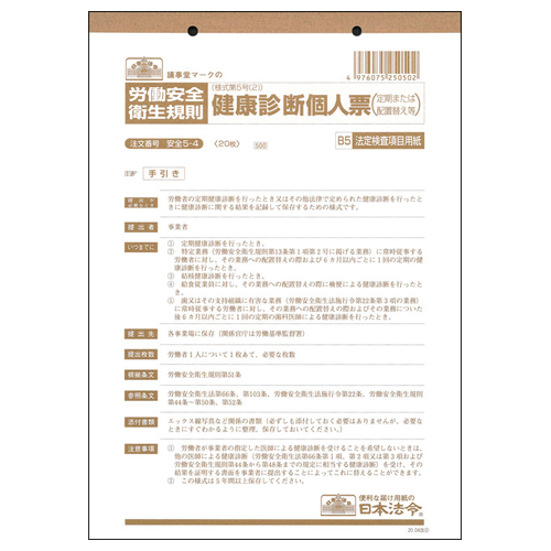 健康診断個人票(定期、配置替え等) B5 20枚 1冊 【5-8営業日遅延】