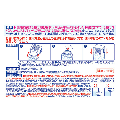 ●ビーズに浸透した有効成分が徐々に揮散するので安定した効果が約250日間持続します。また、ビーズの離液や変色がないので、最後まで見た目もきれいなまま使えます