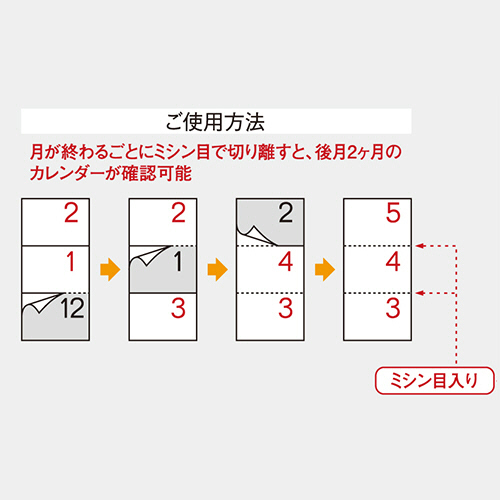 ●1ページに3ヵ月表示で、月ごとにミシン目が入り、切り取ることで常に3ヵ月分表示できる壁掛けカレンダーです。
