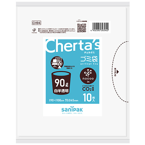 ●90L・厚さ0.045mmの中身が見えにくい白半透明のゴミ袋、10枚入です。