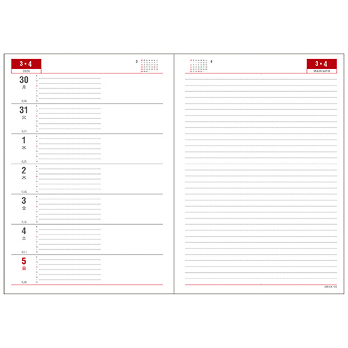 ●左半分が1週間のスケジュール、右半分が横罫のメモスペースで、1週間の予定とメモを見開きで管理できる人気のレイアウトです。