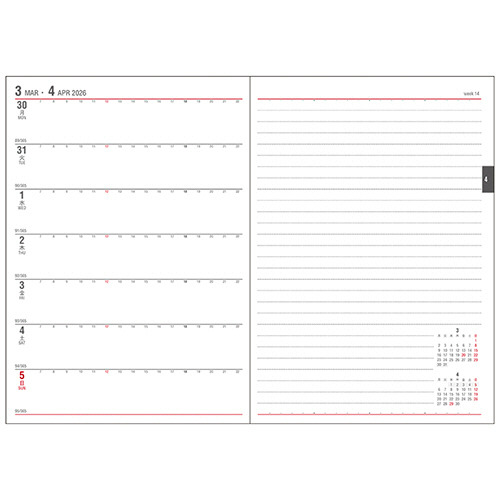 ●左半分が1週間のスケジュール、右半分が横罫のメモスペースで、1週間の予定とメモを見開きで管理できる人気のレイアウトです。