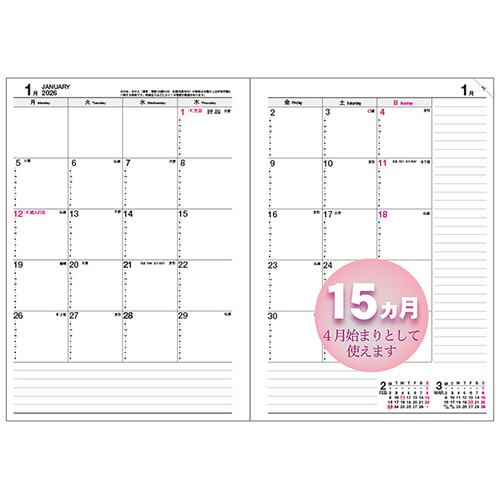 背がしなやかで綴じ目まで開きやすい。糸かがり綴じ製本のブロックタイプ見開き1ヵ月ダイアリーです。