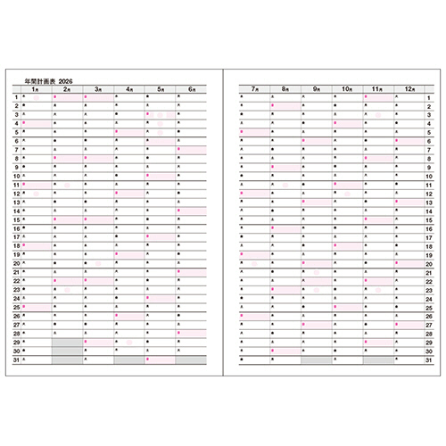 ●内容/年間計画表、プランニングテーブル、LIFE PLAN、月間ダイアリー(15ヵ月)、統計4ページ、ノート109ページ、アドレス4ページ