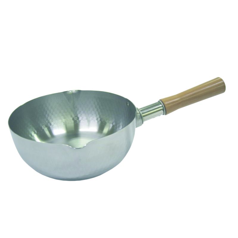 天然木で安定感あるハンドル。持ち手はオール熱源対応。外観は手作り感あふれる鎚目仕上げ。サイズ:180mm材質:18-0ステンレス/[ハンドル]天然木容量:1.7L180mm