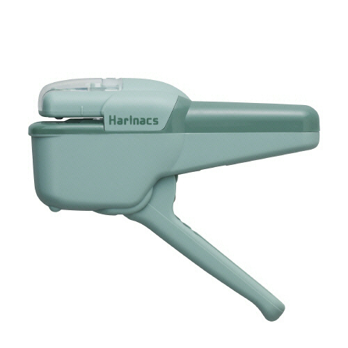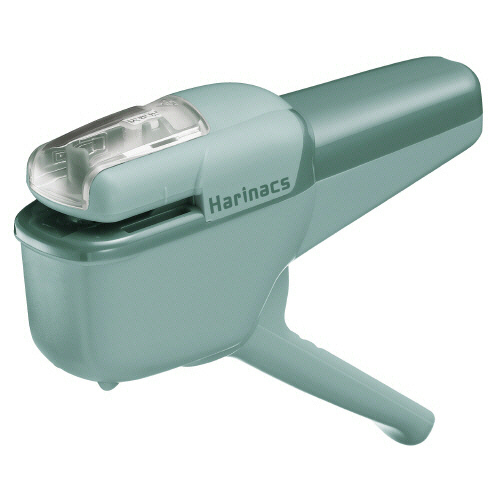 ●手に持ったまま、軽い操作でコピー用紙(PPC用紙)約10枚をとじられる針なしステープラー。色はブルーグリーンです。