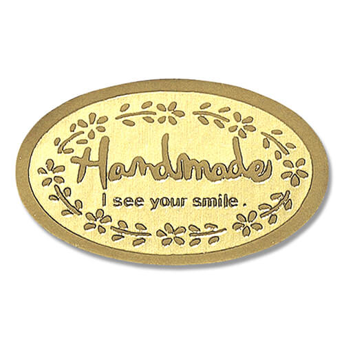 サイズが縦22×横36mmのギフトシール。材質は消金ホイル紙で、「Handmade」(手作り)の文字とメッセージ「I see your smile」が入っています。ハンドメイド雑貨やお菓子等のラッピングのアクセントにいかがでしょうか。