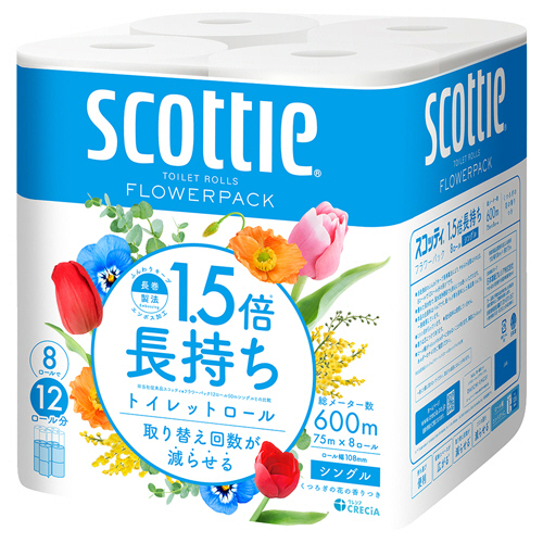 ●8ロールで12ロール分の長さ。長持ちタイプのトイレットペーパー、シングルです。(※従来品スコッティ フラワーパック12ロールとの比較。)