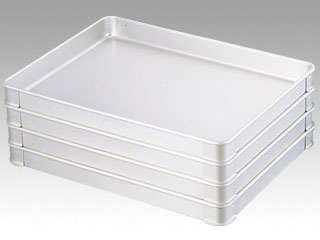 足金具に工夫をし、L型にしました。スタッキングも良好でかつ途中のバットを簡単に引き抜くことが出来ます。底に出っぱっていないため冷蔵庫への出し入れも非常に楽です。5アイテムに拡大。サイズ:414×312×50mm材質:アルミ414×312×50mm