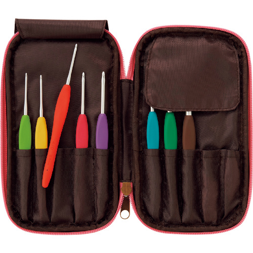 ●ジッパーの付いたポーチ型ケース。 グリップ付かぎ針が10本収納できます。かぎ針編みに必要なメジャー、小さいはさみ、段数マーカー、とじ針などが入るサイドポケット付。かぎ針を入れるスペースも、ジッパー付なのでゆとりがあり、コピーした編み図(A4の4つ折り)なども入れる事ができます。シンプルなデザインながら、収納力のあるジッパー付のかぎ針ケースです。