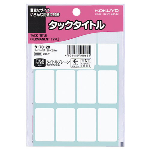●台紙から外して、すぐ貼れる、白無地、20×35mmのタックタイトル。204片×10パックです。