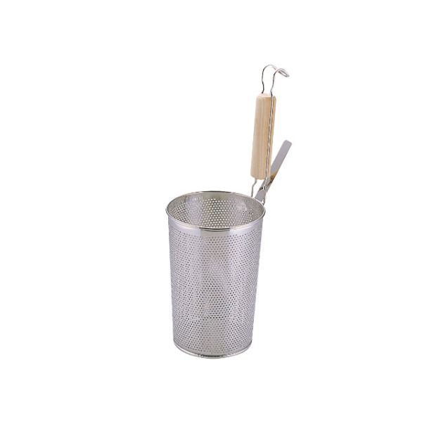 深型で底が平らになっており、ざるうどん等の麺類を煮たり、水切りをするのに便利です。木柄なので熱が伝わりにくく持ち易い形状です。サイズ:直径φ130×高さ200mm材質:ポリカーボネート、ステンレス直径φ130×高さ200mm