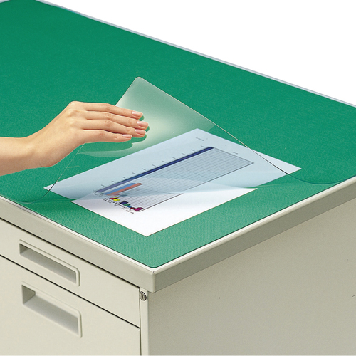 デスクマット自体に薄い透明グリーン色がついています。ライトグリーン色の樹脂製、下敷き付。