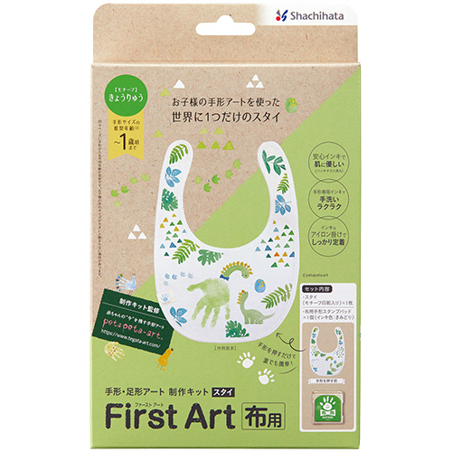 ●セット内容/スタイ(きょうりゅうの印刷面入)×1枚、布用手形スタンプパッド(きみどり)×1個