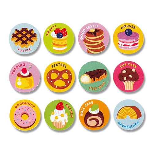 洋菓子のイラストが印刷されたアソートタイプのギフトシール。サイズは直径18mmで、材質は光沢紙です。かわいらしいタッチで12種類のイラストが描かれています。お子様へのギフトやお手紙の封かんなどにピッタリです。また、日々のタスクを達成したときのごほうびシールとしてもお使いいただけます。