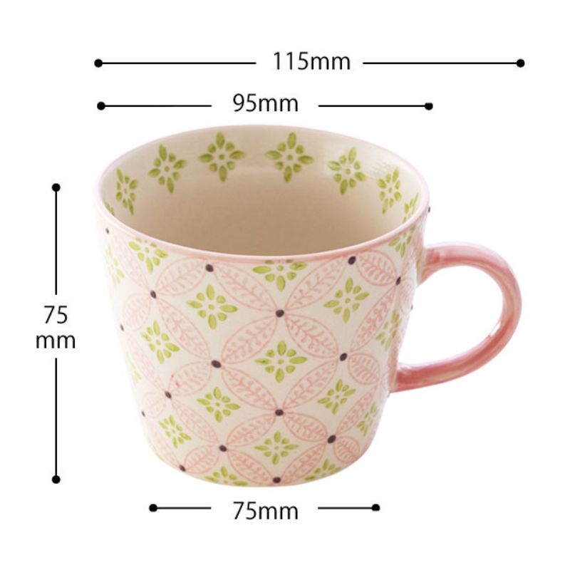 手描き風の花柄がかわいいピンクと緑の陶器のマグカップです。箱に入れて納品いたしますので、そのまま雑貨として販売していただけます。お菓子などを入れるラッピングの器としてもおすすめです。箱付き。食品対応。食品衛生法適合商品。サイズ:W115(75)×H75mm材質:陶器容量:約340ml115×75mm