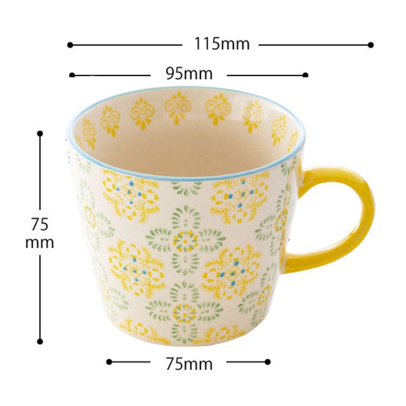 手描き風の花柄がかわいい黄色と緑の陶器のマグカップです。箱に入れて納品いたしますので、そのまま雑貨として販売していただけます。お菓子などを入れるラッピングの器としてもおすすめです。箱付き。食品対応。食品衛生法適合商品。サイズ:W115(75)×H75mm材質:陶器容量:約340ml115×75mm
