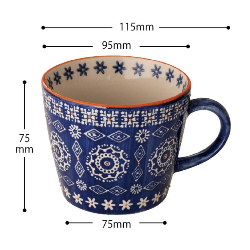 手描き風の柄がかわいい青の陶器のマグカップです。箱に入れて納品いたしますので、そのまま雑貨として販売していただけます。お菓子などを入れるラッピングの器としてもおすすめです。箱付き。食品対応。食品衛生法適合商品。サイズ:W115(75)×H75mm材質:陶器容量:約340ml115×75mm