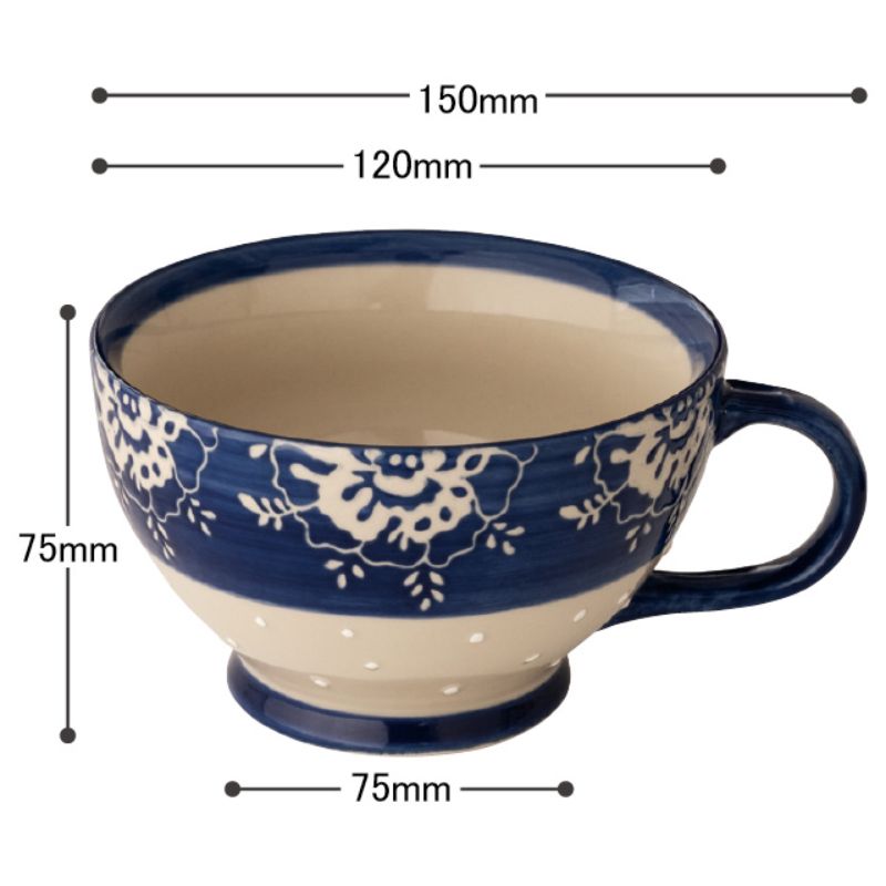 手描き風の柄がかわいい青の陶器のマグカップです。少し大きめで、スープボウルとしてもお使いいただけます。箱に入れて納品いたしますので、そのまま雑貨として販売していただけます。お菓子などを入れるラッピングの器としてもおすすめです。箱付き。食品対応。食品衛生法適合商品。サイズ:W150(75)×H75mm材質:陶器容量:約410ml150×75mm