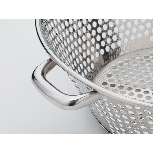 底が平らな揚げザルです。取っ手はパイプハンドルで固定されています。サイズ:直径φ550×高さ200mm、パンチング穴φ10mm材質:18-8ステンレス直径φ550×高さ200mm、パンチング穴φ10mm