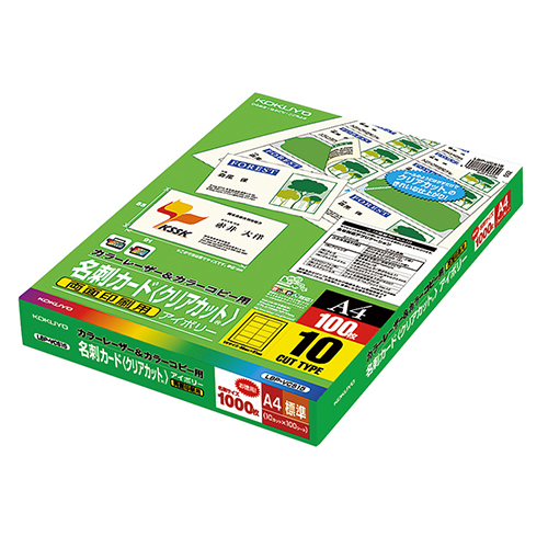 ●ふちの仕上がりがすっきりとしたカラーレーザー、カラーコピー用クリアカット仕様の名刺カード。アイボリー色の10面100シート入です。