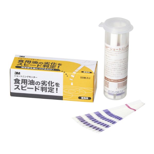 3M ショートニングモニターは、誰でも簡単に確実に油の劣化状況を測定できるので、 飲食店における油の品質管理に適した製品です。使える油を捨てるようなムダをせず、いつものおいしさを維持するのにお役に立ちます。サイズ:[ボトル容器]φ40×100mm、[試験紙サイズ]93×7mm材質:[基材]紙、[測定部]湿潤材、アルカリ剤、酸・塩基指示薬重量:0.27kgφ40×100mm