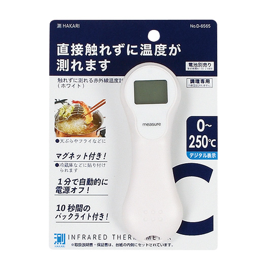 直接触れずに測れる。赤外線温度計。0~250℃デジタル表示。マグネット付きなので冷蔵庫などにくっつけられます。1分で自動的に電源オフ。10秒間のバックライト付。油の温度管理に最適です。[電源]単4形乾電池1.5V(2本)、[オートオフ]約60秒、[測定範囲]0~250℃(電池別売り)、[原産国]中国。