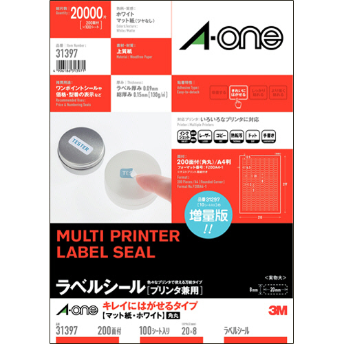 ●キレイにはがせる各種プリンター兼用のラベルシール、200面四辺余白付(角丸)、100シート入です。