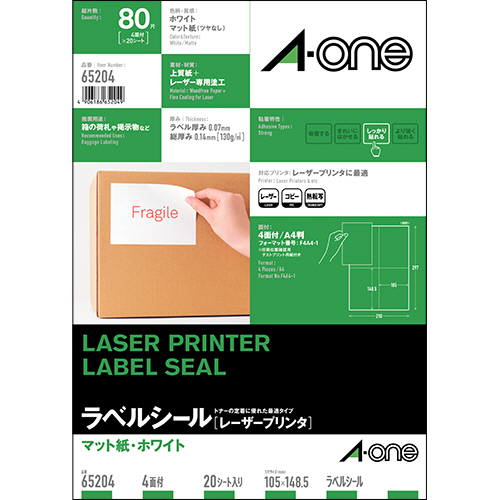 ●マット紙仕様のレーザープリンター用ラベルシール、4面、20シート入です。