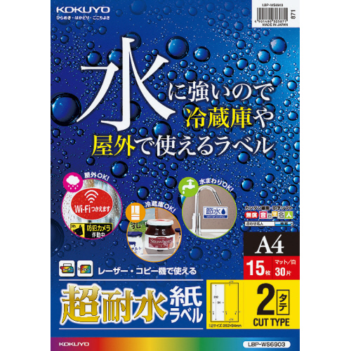 ●耐水・耐久性に優れたラベルなので、水に濡れても大丈夫。室内の水まわりの表示ラベルや値札のほか、屋外掲示などに好適です。