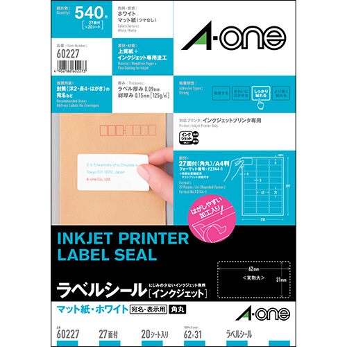 ラベルシール[インクジェット]マット紙・ホワイト A4 27面62×31mm四辺余白 角丸 1冊(20シート)
