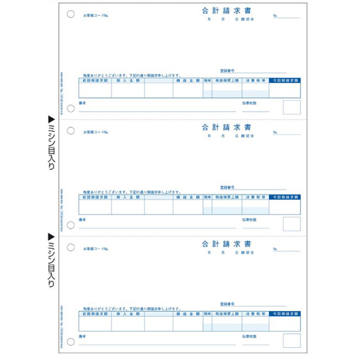 ●軽減税率に対応した、インボイスタイプの合計請求書。A4 3面、6穴、500枚です。