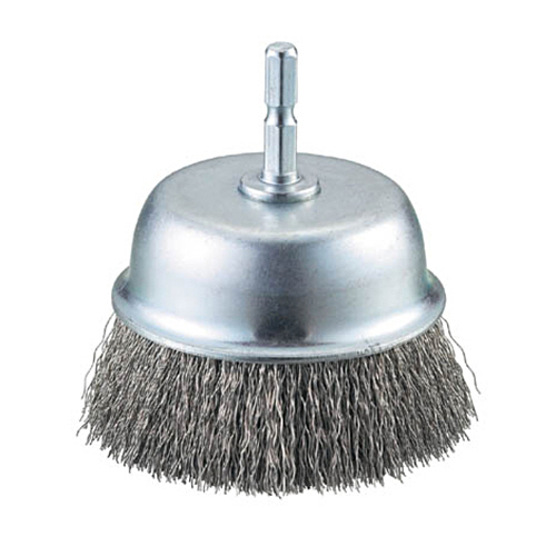 ●金具:スチール(鉄)材●0.3mmステンレス線●線径(mm):ステンレス0.3●外径×毛丈×軸長×軸径(mm):75×25×27×6.35●最高使用回転数(rpm):3000●六角軸付のカップ型ブラシ●0.3ステンレス線仕様