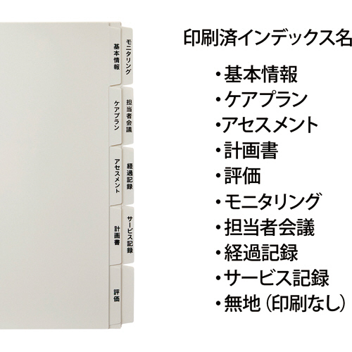 ●印刷済みインデックス名/基本情報、ケアプラン、アセスメント、計画書、評価、モニタリング、担当者会議、経過記録、サービス記録、無地(印刷なし)