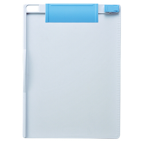 ●本体上部に吊り下げ穴があるので簡単にフック等に掛けられます。A5タテ、青×ライトグレーのクリップボードです。