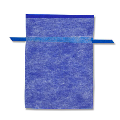 不織布を2層に重ねたギフト巾着袋。両脇のリボンを引っ張って結ぶだけの簡単ラッピング。ベースのネイビー色の上に薄手の白を重ねることで、やさしく上品なイメージのギフトに仕上がります。底にマチがあって広がるので、見た目よりも容量があります。