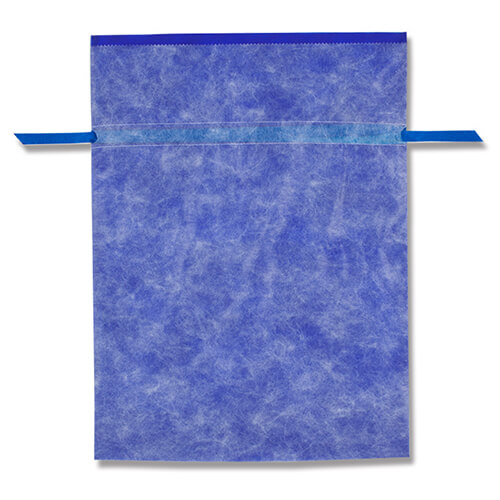 不織布を2層に重ねたギフト巾着袋。両脇のリボンを引っ張って結ぶだけの簡単ラッピング。ベースのネイビー色の上に薄手の白を重ねることで、やさしく上品なイメージのギフトに仕上がります。底にマチがあって広がるので、見た目よりも容量があります。