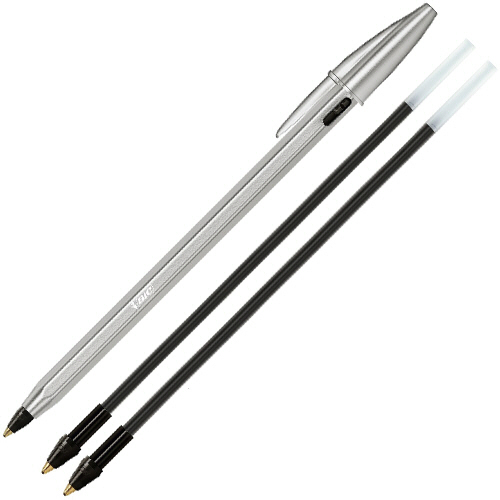 ●本体と一緒に2本の替え芯をセットしており、交換して使うことができるリフィラブル方式を採用しています。ボール径1.0mm、軸色メタルシルバーです。