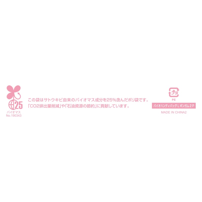 ● ●入数:100枚●両面印刷●表面エンボス加工あり【印字内容】この袋はサトウキビ由来のバイオマス成分を25%含んだポリ袋です。