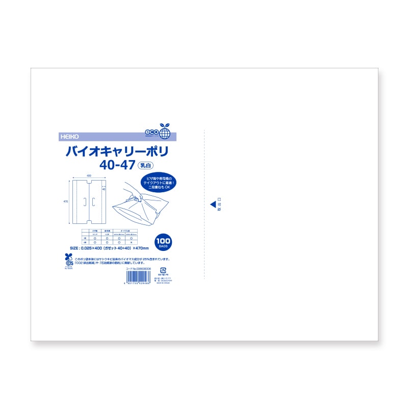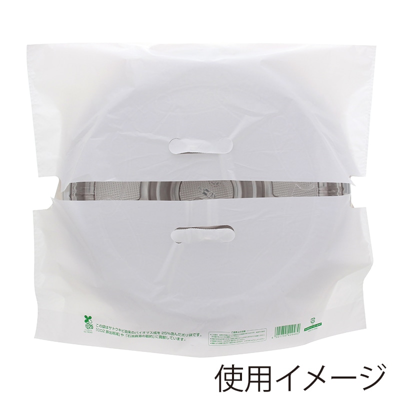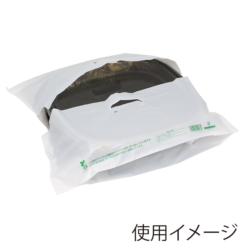 ● ●適用サイズ:ピザ箱10インチ(二段まで)、寿司桶3人前用、4人前用(二段まで)、オードブル皿Φ310×高45mm(二段まで)、Φ320×高28mm(二段まで)、Φ350×45mm(一段まで) ●入数:100枚 【印字内容】この袋はサトウキビ由来のバイオマス成分を25%含んだポリ袋です。