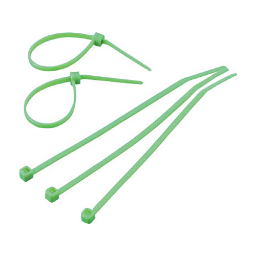●66ナイロン●色:緑●幅×長さ(mm):3.6×150●厚み(mm):1.28●最大結束径(mm):36●最小結束径(mm):3●引張強度(N):176.4●使用温度範囲:-40~80℃●標準タイプ・屋内用